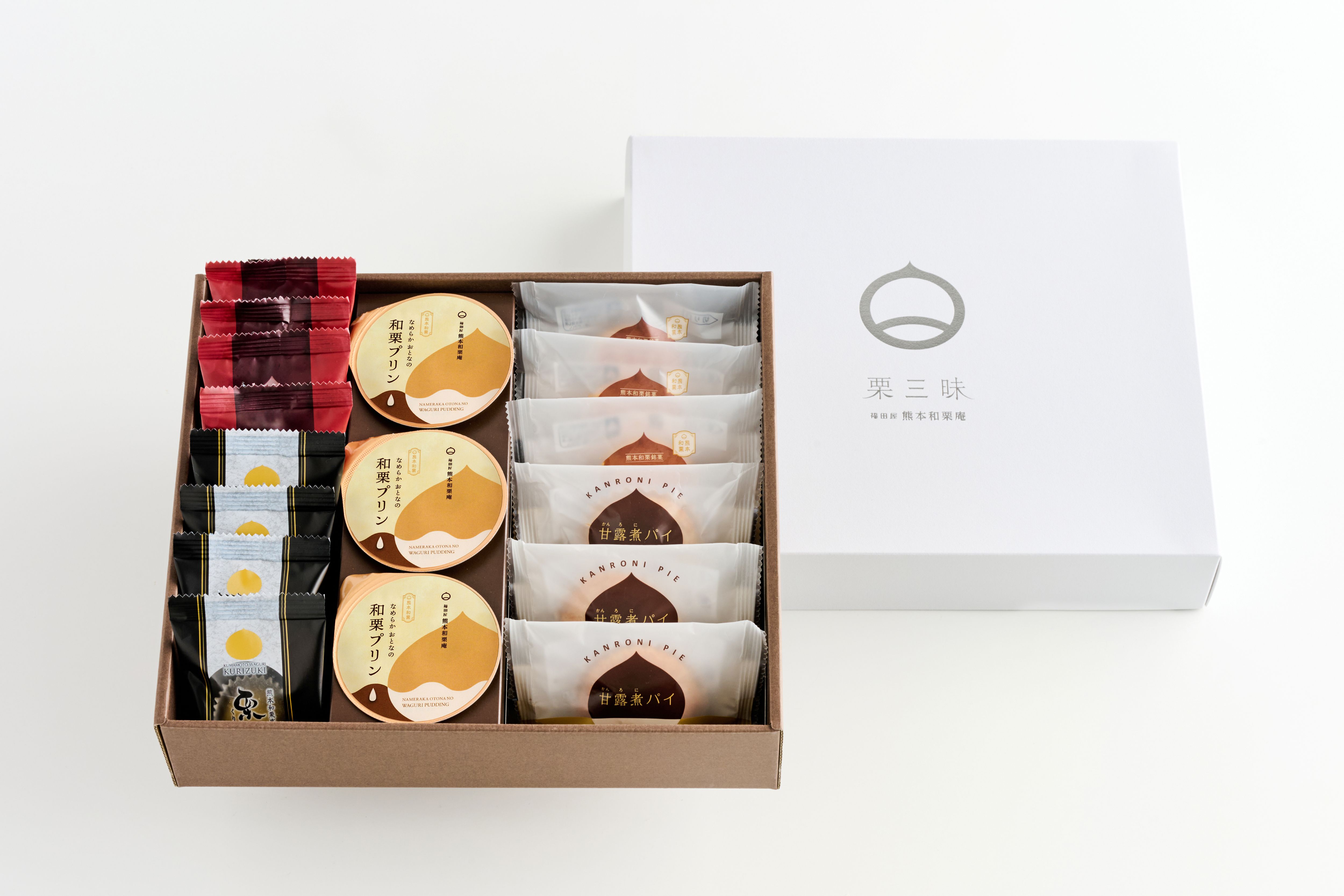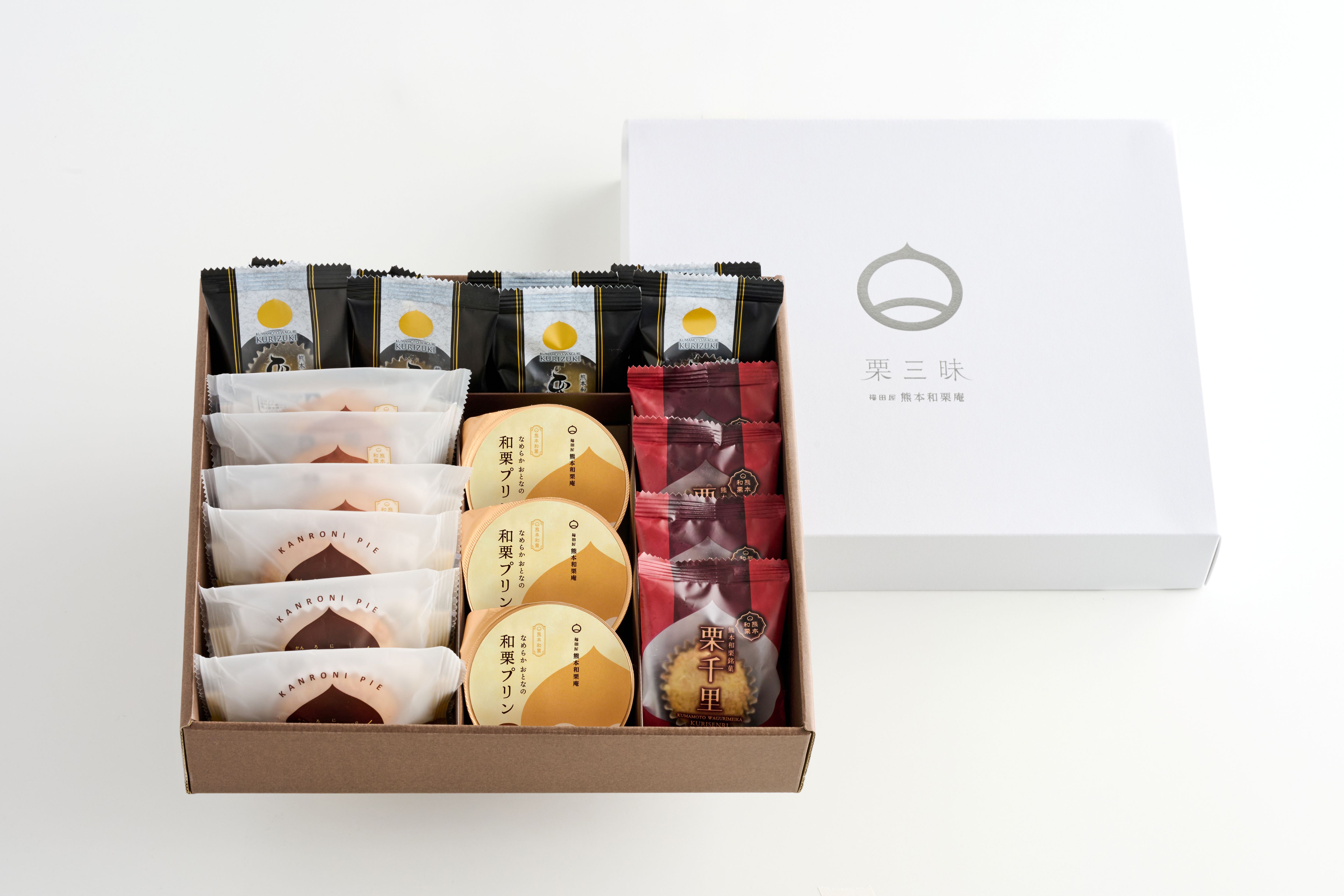 内容量:栗好き8個・栗千里4個・甘露煮パイ3個・栗うまか3個・和栗プリン3個